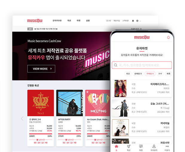 2017년 7월 첫 서비스를 선보인 뮤직카우는 90년대 인기 곡부터 아이돌 곡 등 거래가 가능한 다양한 K팝의 저작권을 공개하고 있으며 현재까지 약 590여곡이 거래되고 있다.