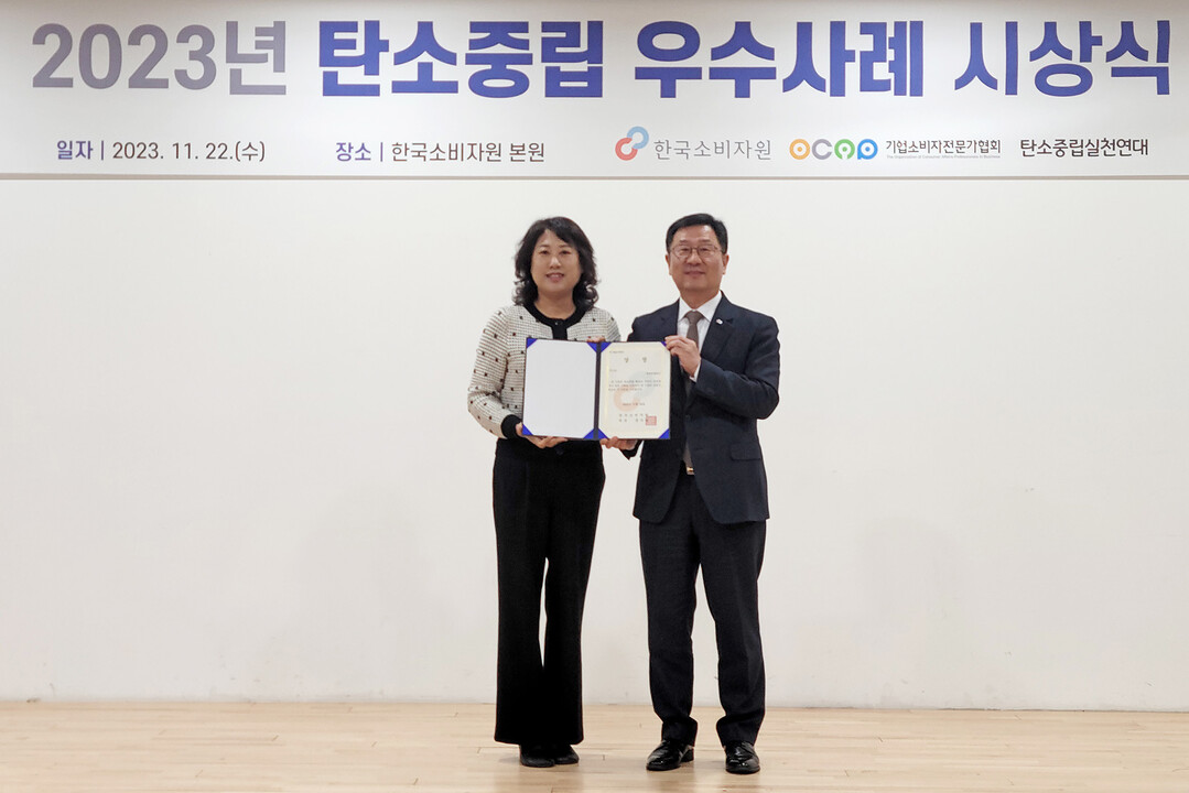 | 지난 22일 한국소비자원 본원서 열린 탄소중립 실천기업 우수사례 시상식서 유한킴벌리 김진희 고객만족본부장(왼쪽)이 수상 후 한국소비자원 윤수현 원장(오른쪽)과 함께 기념촬영에 임하고 있다. [사진=유한킴벌리] |