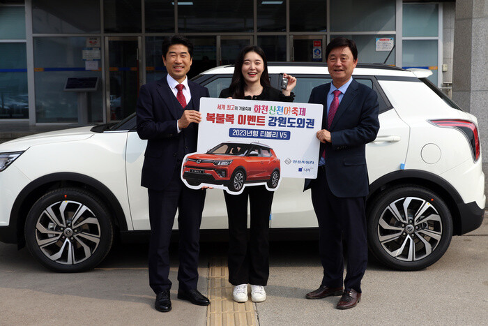 [하비엔뉴스 = 이길주 기자] 쌍용자동차는 2023 화천 산천어 축제의 현장 응모 이벤트에서 행운을 거머쥔 당첨자에게 티볼리 경품 전달식을 진행했다고 9일 밝혔다.
