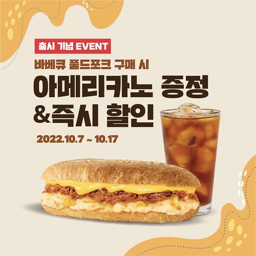 7~17일 진행하는 이번 행사는 신메뉴 ‘바베큐 폴드포크’를 구매하면 유인매장에서는 아메리카노를 무료로 증정하고, 무인매장에서는 10% 할인 혜택을 구매 횟수나 수량 제한 없이 제공한다.