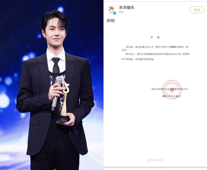 24일 왕이보(王一博, 왕일박)의 소속사 위에화엔터테인먼트 측은 공식 웨이보를 통해 "오늘부터 우리 회사 및 우리 회사 연예인 왕이보 선생은 나이키와 관련된 모든 것을 중지한다"고 성명서를 냈다.