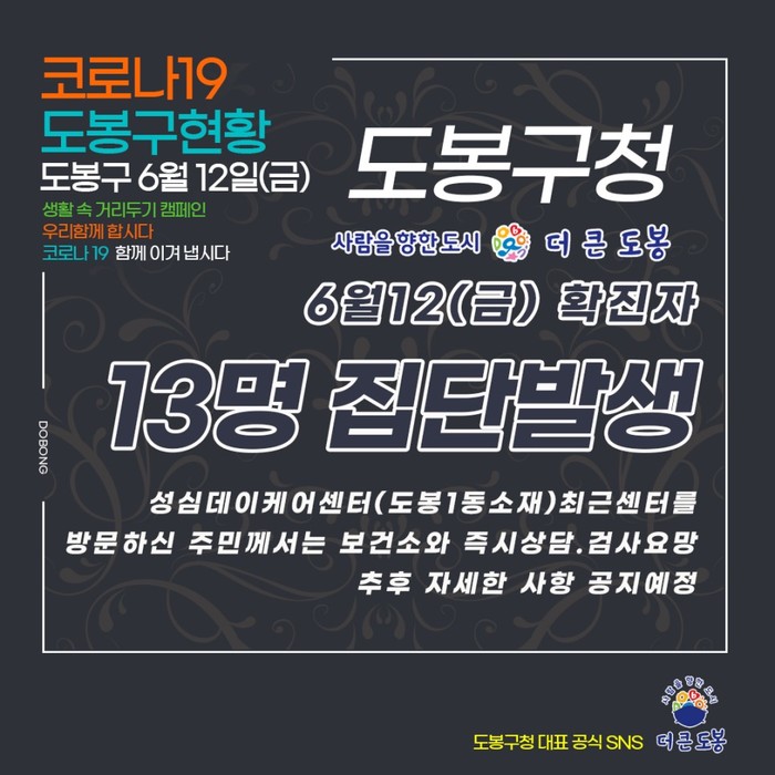 글과 함께 '도봉구청 6월12(금) 확진자 13명 집단발생'이라는 문구가 담긴 이미지를 덧붙였다.