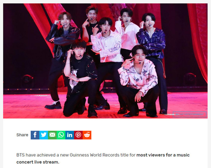 기네스 세계기록은 22일(현지시간) 홈페이지에서 "방탄소년단이 가장 많은 시청자가 본 라이브 스트리밍 음악 콘서트로 새로운 기네스 세계기록을 달성했다"고 밝혔다.