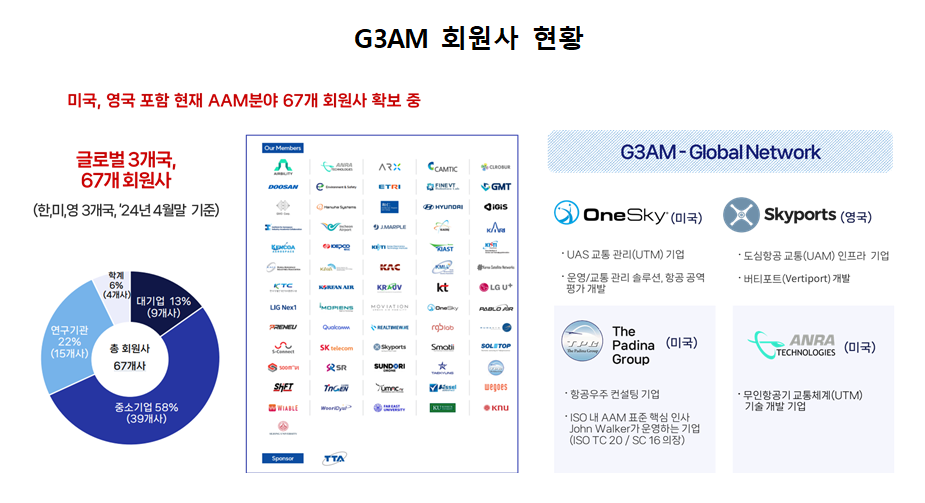 G3AM의 창립회원으로는 대한항공, 인천국제공항공사, 파인브이티로보틱스, 한화시스템, 한국공항공사, 현대자동차 이동통신3사 등 AAM 관련 핵심 국내 기업 63개와 AAM 분야 다국적 기업인 Onesky, Skyports, Padinagroup, ANRA Technologies 등이 참여했다. 또 Joby Aviation, Volocopter 등 다국적 기업도 회원가입을 검토 중인 것으로 알려졌다.