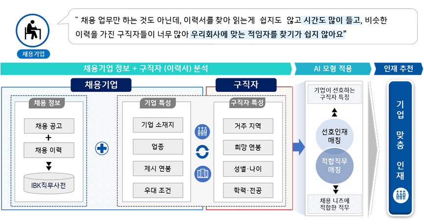 채용공고와 이력서상 직무를 79개로 상세화한 ‘IBK직무사전’을 활용해 채용공고 우대조건과 산업별 선호조건·채용이력, 인재성향 등 정보를 AI 알고리즘으로 분석해 정확도를 높였다. 이 서비스는 아이원잡에서 신청할 수 있으며 신청 다음 날 곧바로 인재추천 정보를 제한다.