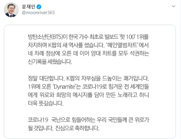 1일 문재인 대통령은 SNS에 "방탄소년단(BTS)이 한국 가수 최초로 빌보드 '핫 100' 1위를