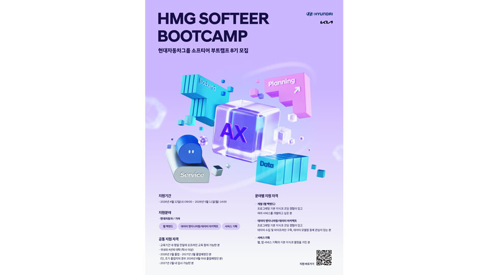 [HBN뉴스 = 김재훈 기자] 현대자동차·기아는 22일부터 5월 11일까지 소프트웨어 분야 신입사원 채용을 연계한 소프티어 부트캠프 8기를 모집한다고 밝혔다.