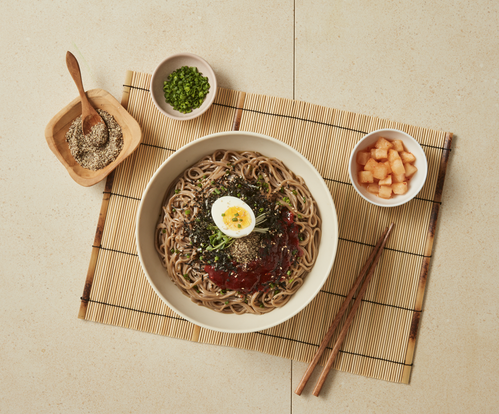 이 제품은 매콤·새콤·달콤한 특제비빔소스에 들기름과 들깨가루, 김깨고명을 더해 고소한 맛을 풍성하게 구현했고, 볶은 메밀가루를 함유한 반죽을 수타 방식으로 제면했다.