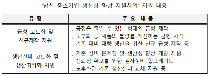 | ‘방산 중소기업 생산성 향상 지원사업’ 주요 내용. [자료=방위사업청] |