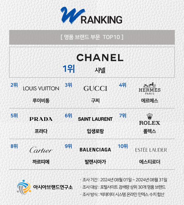 한정근 아시아브랜드연구소 대표는 “최고급 소재, 장인정신, 혁신적 디자인 3대 요소로 평가되는 명품 브랜드는 전 세계 고객들에게 오랜 역사와 높은 품질로 사랑받고 있다”며 “W랭킹 명품 브랜드 부문 1위에 오른 샤넬은 오픈런(매장 질주 현상)을 빗댄 ‘샤넬런’이란 신조어가 생길 만큼 존재감을 입증하고 있지만, 지속적인 가격 인상과 사회공헌활동 부진 등은 샤넬을 비롯한 명품 브랜드들이 풀어야 할 과제다”라고 말했다.