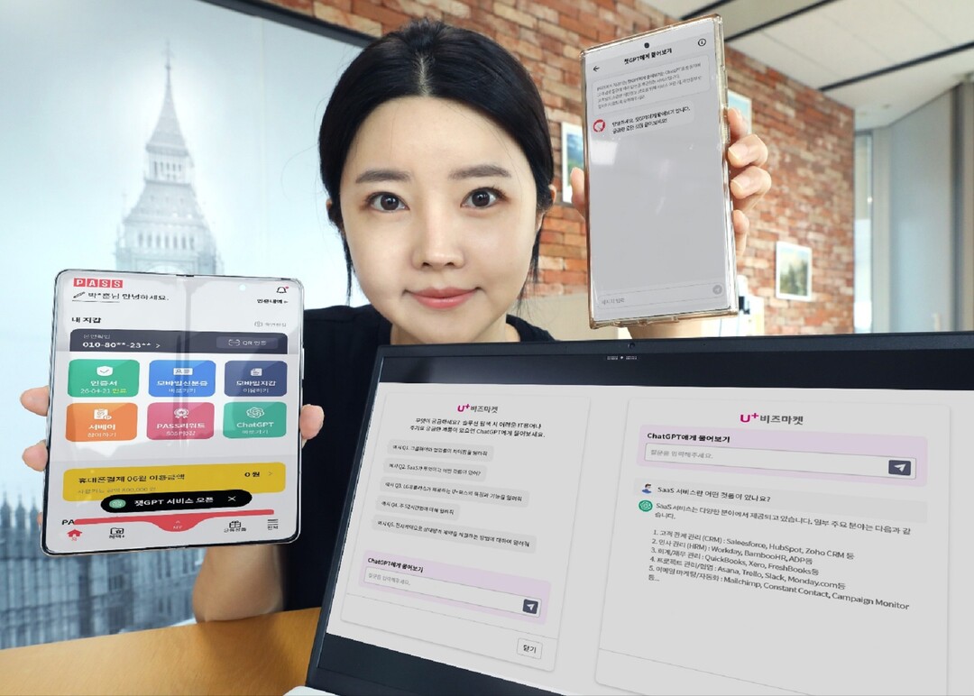 [하비엔뉴스 = 이길주 기자] LG유플러스는 기업 솔루션 통합 판매 포털 ‘U+비즈마켓’ 공식 웹사이트와 본인 인증 간편인증 서비스 ‘PASS by U+’ 앱에 AI챗봇 서비스 ‘챗GPT’를 도입, 서비스 경쟁력을 강화해 나간다고 21일 밝혔다.