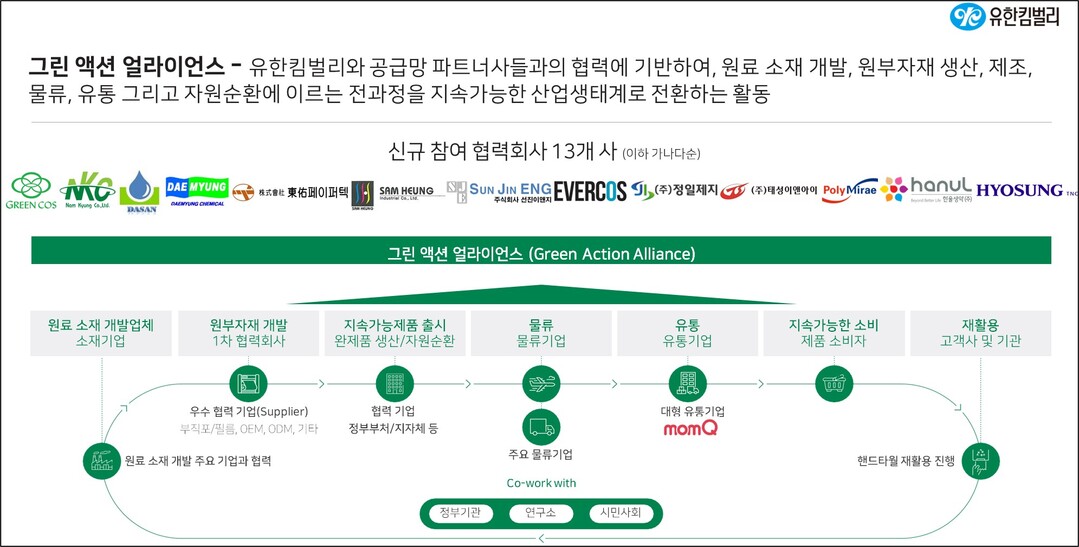 유한킴벌리가 주도하고 있는 ‘그린 액션 얼라이언스’는 공급망 파트너 기업/기관과 협력에 기반하여 원료 소재 개발부터 원부자재 생산, 제조, 물류, 유통, 그리고 자원순환에 이르는 전과정을 지속가능한 산업생태계로 전환하는 활동이다. 올해 말까지 누적 70개 이상의 기업/기관과 협력을 확산할 예정이다.
