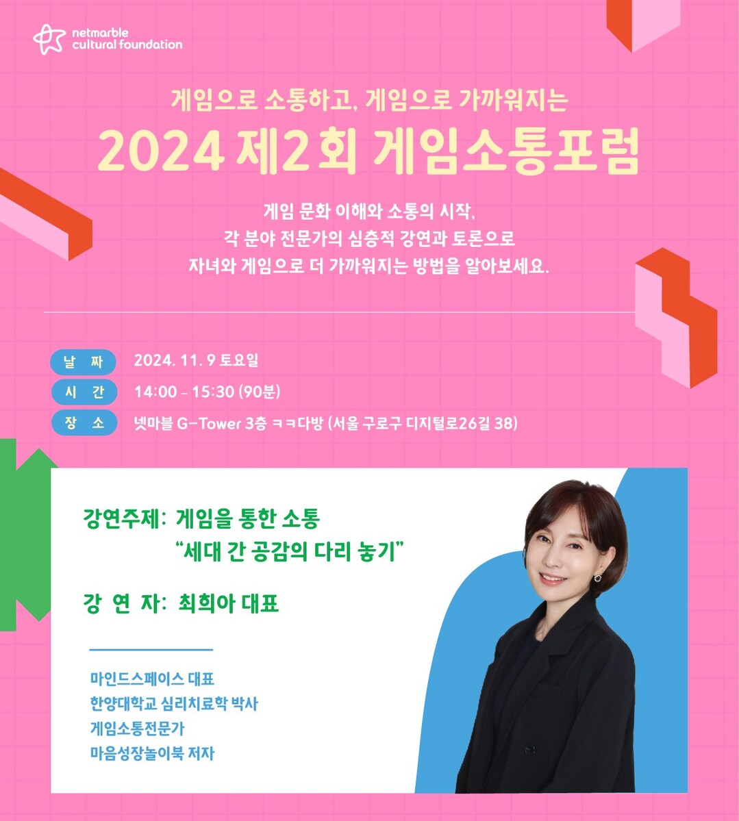 올해 마지막으로 열리는 이번 포럼은 오는 11월9일 넷마블 지타워에서 진행되고, 최희아 마인드스페이스 대표가 ‘게임을 통한 소통-세대 간 공감의 다리 놓기’를 주제로 강연에 나선다.