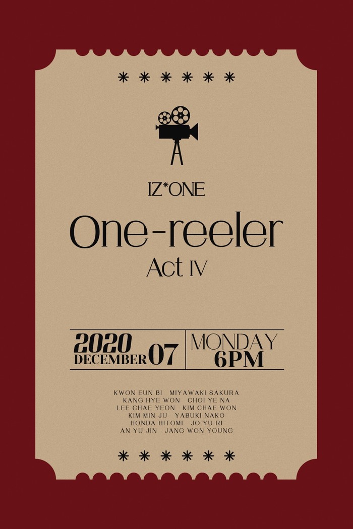 공개된 이미지에는 'One-reeler(원릴러)'라는 앨범명과 '2020 DECEMBER 07 MONDAY 6PM'이라는 발매 시점이 담겼다. 상단에는 영사기 그림과 하단에는 아이즈원 멤버들의 이름이 나열돼 영화 포스터의 느낌을 물씬 풍긴다.