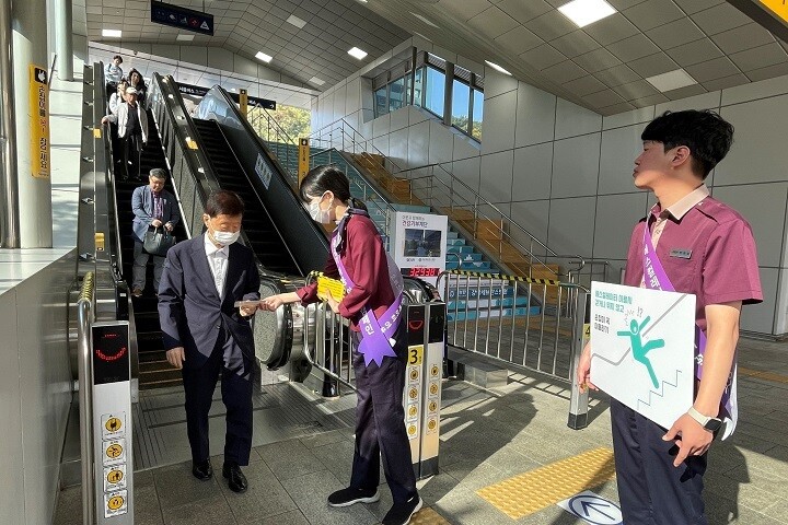 이날 수서관리역은 지역포럼단과 함께 역사 내 에스컬레이터를 이용하는 고객들에게 안전 수칙 안내문을 배부하고, 올바른 승강기 이용법을 안내했다.