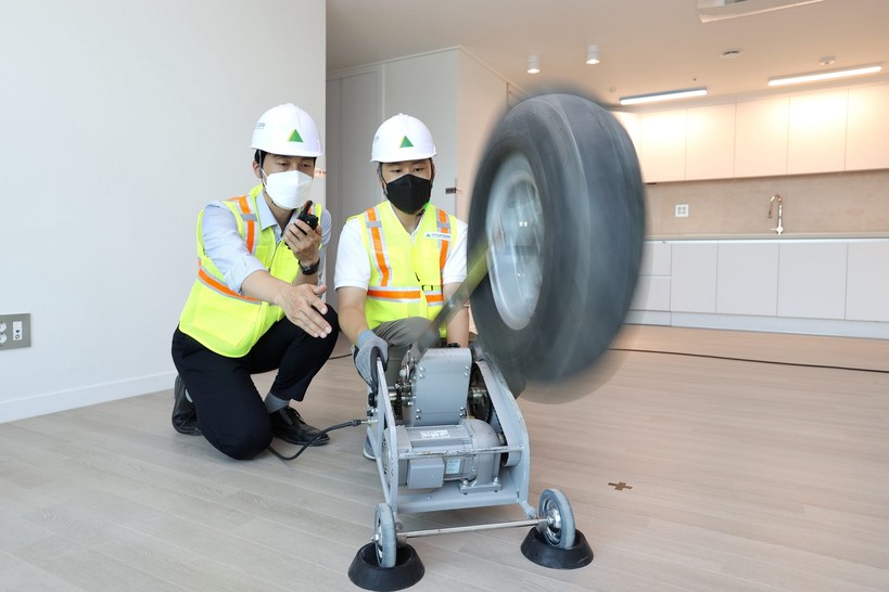 현대건설은 ‘H 사일런트홈 시스템’을 개발해 지난해 5월 국내 건설사 최초로 실험실이 아닌 현장에서 층간소음 저감기술을 인정받았다. 이어 같은 해 8월에는 1등급 기술을 확보, 국가공인시험기관인 한국건설생활환경시험연구원(KCL)에 의뢰해 뱅머신(타이어가 부착된 층간소음 측정장비) 중량충격음 차단 1등급 39dB(데시벨) 성능을 공식 확인했다.