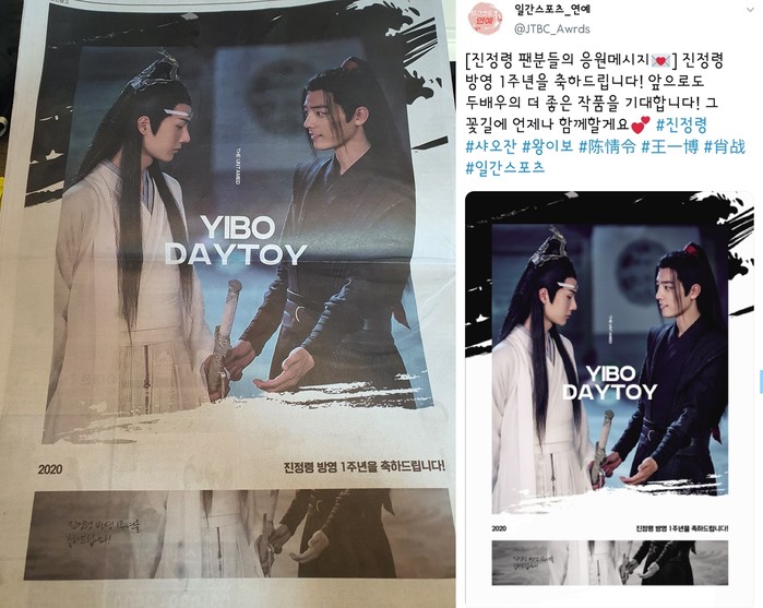 이는 '진정령' 중국 팬들이 방영 1주년을 기념하기 위해 한국에 광고를 게재한 것.