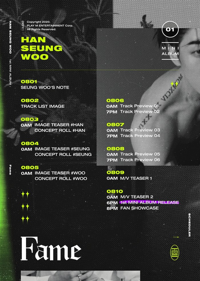 소속사 플레이엠엔터테인먼트 측은 31일 0시 빅톤 공식 SNS 및 팬카페를 통해 한승우 미니 1집 'Fame(페임)'의 콘텐츠 공개 일정을 담은 스케줄러 이미지를 게재해 이목을 집중시켰다.