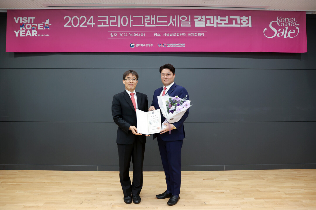 | 코레일유통이 2024 코리아그랜드세일 우수 참여기업으로 문화체육관광부 장관상을 받았다. (좌측부터) 박종택 문화체육관광부 관광정책국장, 유원종 코레일유통 유통사업본부장 [사진=코레일유통] |