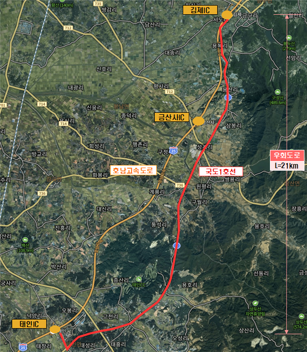 23일 도로공사에 따르면, 이번 공사는 2020년 6월부터 진행된 정읍IC-김제IC 구간(33㎞) 개량공사의 일환으로 노후화된 금산사IC 진출입로를 아스팔트로 재포장 하는 것이다. 이를 통해 진출로는 25일, 진입로는 26일 각각 야간시간대에 진행된다.