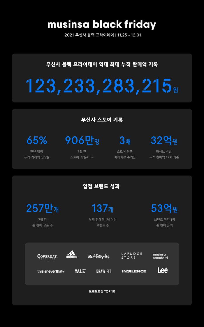 블랙 프라이데이 특집으로 진행된 무신사 라이브에 대한 반응도 뜨거웠다. 행사 기간 총 7회 진행된 무신사 라이브는 32억 6000만 원 이상의 판매 매출을 기록했고, 누적 접속자 수는 59만 명을 넘어서는 등 높은 호응을 얻었다.
