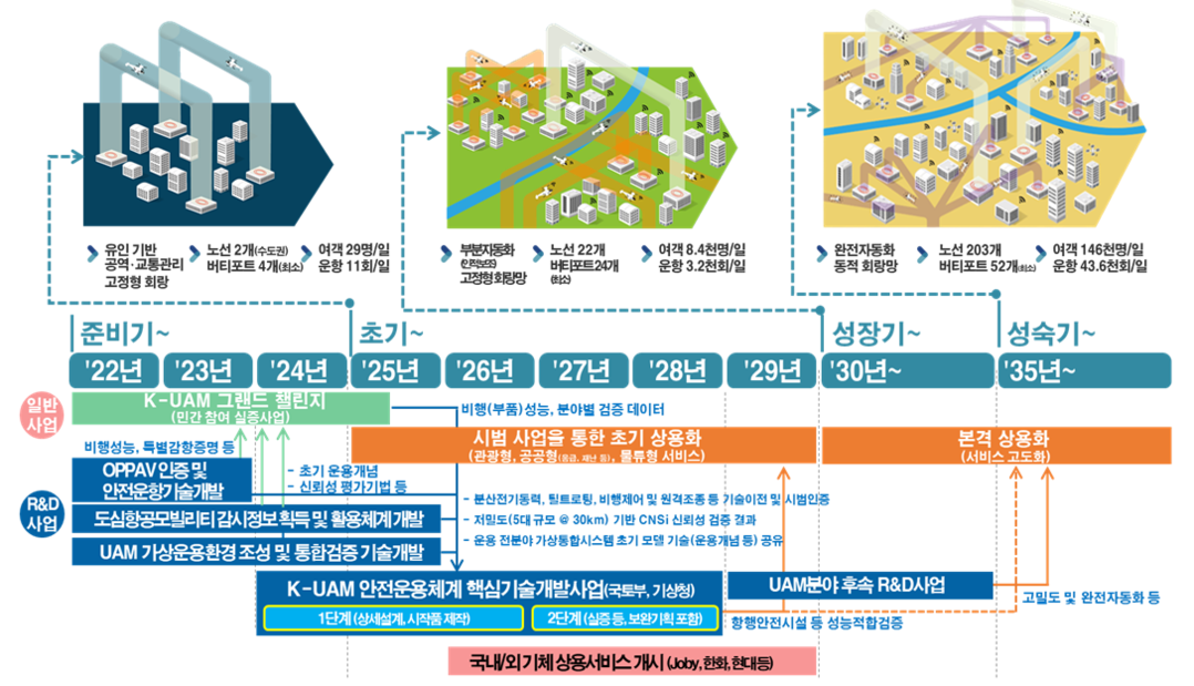 | 정부의 UAM 추진 로드맵 및 국가연구개발사업과 연계·적용 방안(안). [자료=국토교통부] |