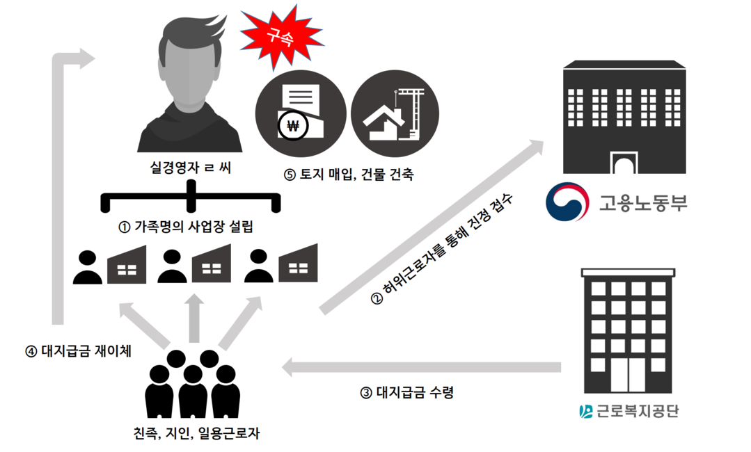 특히 가족, 지인 등 다수의 허위근로자를 동원해 대지급금을 받게 하고 일부는 본인이 편취하는 등 죄질이 불량한 사업주 2명은 구속·기소됐다. 이들은 간이대지급금 11억3500만원을 부정수급하거나 시공사 협력업체와 공모해 2억6000만원을 부정수급한 것으로 드러났다.
