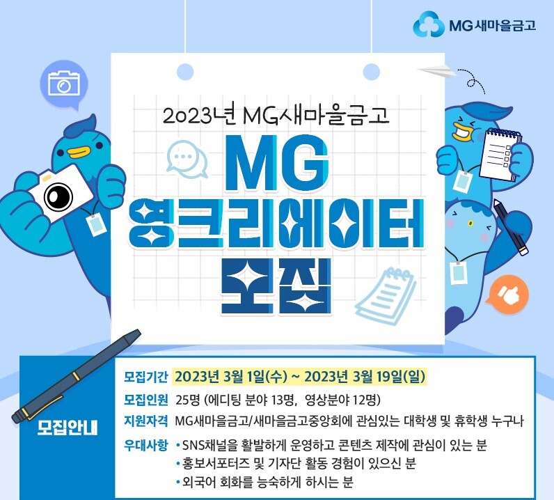 지원 자격은 새마을금고와 새마을금고중앙회에 관심 있는 국내 거주 휴학생 포함 대학생이다. 새마을금고는 에디팅과 영상 분야를 합쳐 총 25명을 선발할 계획이며 선발된 MG영크리에이터는 오는 4월부터 11월까지 8개월간 활동한다.