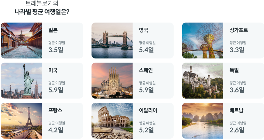 특히 코로나19 유행이 완화된 뒤 3박4일 일정의 일본여행 수요가 가장 많은 것으로 나타났다. 일본에서 트래블로그를 이용한 고객은 전체의 63.1%였고 뒤를 이어 미국11.4%, 프랑스 7.8%, 영국 6.1%, 이탈리아 4.9% 등 순이었다. 방문한 도시는 도쿄 46.3%, 오사카 21.4%, 후쿠오카 17.9% 등 일본 주요 도시로 편중된 것이 눈길을 끈다.