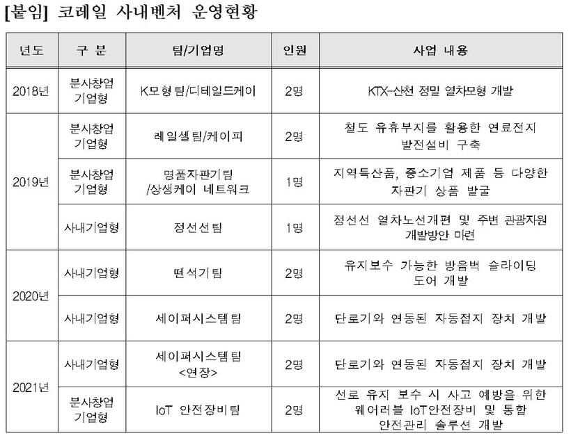 코레일은 지난 2018년부터 정부의 벤처·창업 육성 및 상생협력 정책에 동참하고 철도의 혁신 역량을 활용한 미래성장동력 확보를 위해 해마다 임직원 아이디어 공모를 통해 사내벤처팀을 육성해왔다.