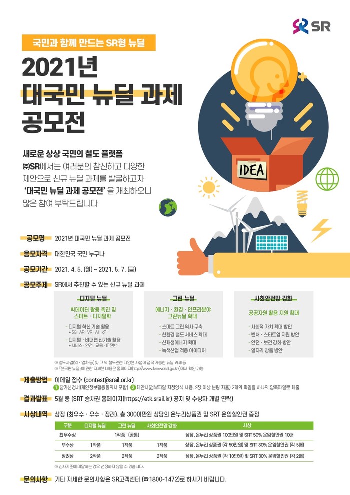 공모주제는 △디지털 뉴딜 △그린 뉴딜 △사회안전망 강화 등 SR과 철도사업에 접목할 수 있는 뉴딜과제로, 참신하고 다양한 아이디어를 공모한다. 대한민국 국민 누구나 참여할 수 있으며 공모기간은 5월 7일까지다.