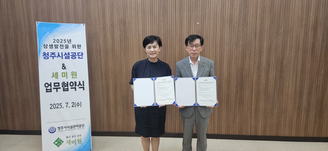 [하비엔뉴스 = 이동훈 기자] 재단법인 세미원(대표이사 백난영)과 청주시시설관리공단(이사장 유운기)는 지난 2일 정원문화 확산과 지역사회 상생 협력을 위한 업무협약(MOU)을 체결했다.