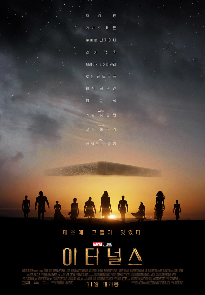 먼저 공개된 티저 포스터 속 떠오르는 태양을 뒤로하고 10명의 ‘이터널스’ 실루엣이 시선을 이끈다. 오랜 세월 인류에게 그 모습을 드러내지 않았던 ‘이터널스’가 본격적으로 자신들의 존재를 드러낸 이유가 궁금증을 자극하며, 어떠한 모습들로 등장할지 호기심을 더한다. ‘이터널스’의 거대한 우주선 ‘도모’ 역시 시선을 압도하며 이들 앞에 펼쳐질 거대한 서사에 대한 기대감을 증폭시킨다.