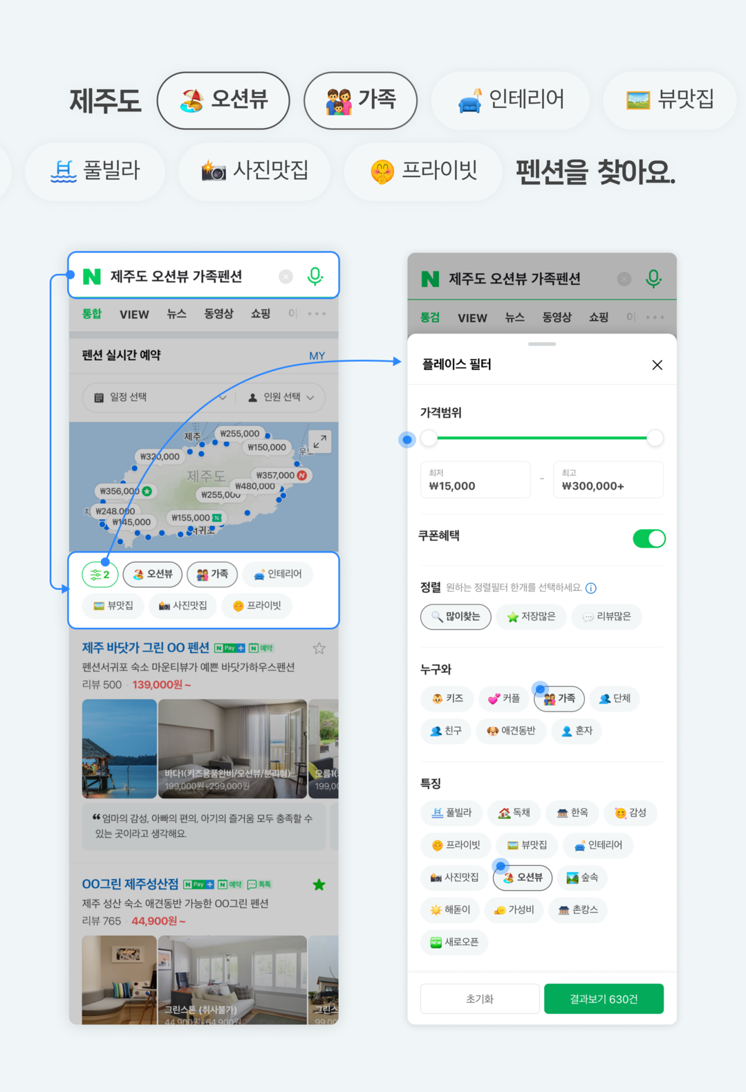 우선 이용자들이 플레이스에 남긴 키워드, 텍스트, 이미지 등 다양한 리뷰 콘텐츠가 검색 결과에 반영됐다. 실제 방문 경험에 따른 숙소의 특징들도 고려해 검색 결과를 제공해 신뢰도 높고 풍성한 숙소 정보를 기반으로 세분화 된 탐색이 가능해졌다.