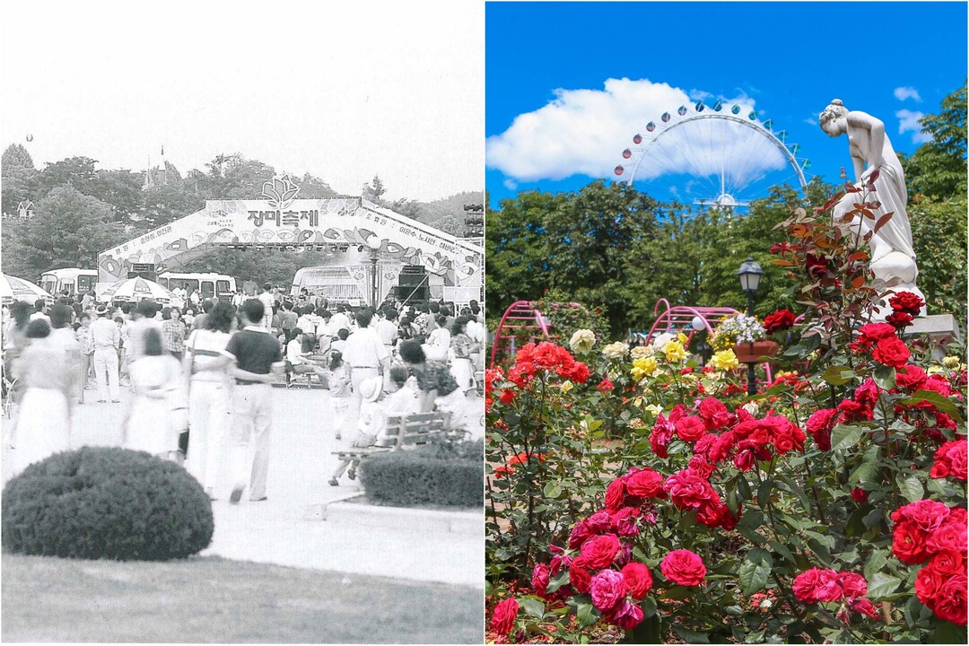 | 1985년 장미축제 개막(왼쪽) 모습과 최근 장미축제 현장 모습. [사진=에버랜드] |