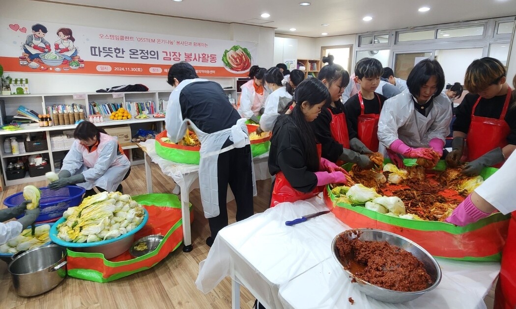 | 지난해 11월 희망스쿨 지역아동센터를 방문한 오스템임플란트 임직원들이 김장을 담그고 있다. [사진=오스템임플란트] |
