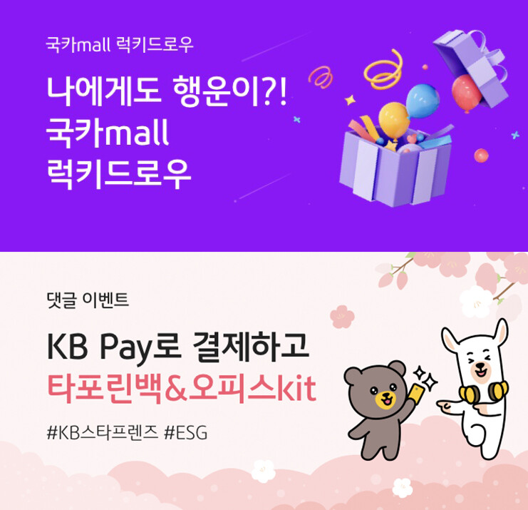 또 오는 26일까지 국카mall에서 ‘KB Pay로 결제하고, 타포린백&오피스kit’ 이벤트에 댓글로 응모한 뒤 KB Pay로 합산 5만원 이상 결제한 고객을 추첨해 ▲100% 자연 분해가 가능한 친환경 오피스 키트 10명 ▲실생활에서 작은 ESG활동을 실천할 수 있는 타포린 소재 다회용 장바구니(2개) 40명 등 모두 50명에게 경품을 선사한다.