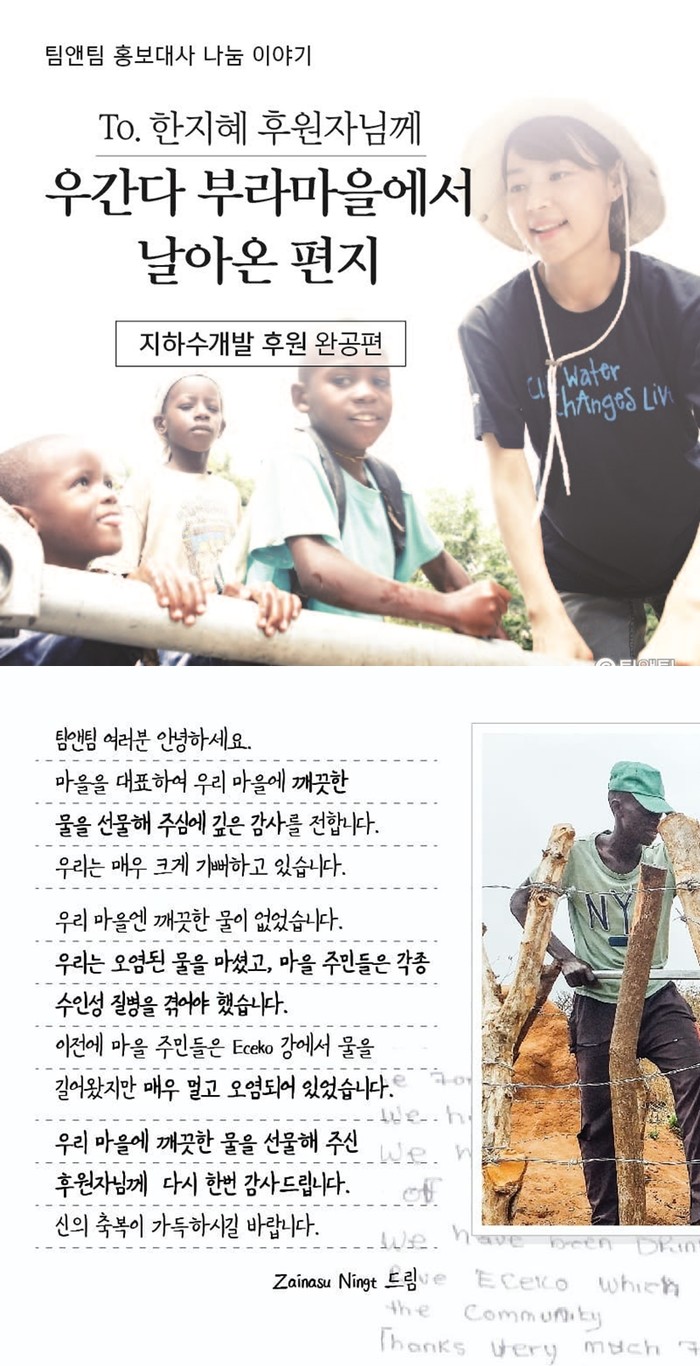 국제구호개발 NGO ‘팀앤팀’(이하 팀앤팀)은 9년째 팀앤팀의 홍보대사로 활동 중인 한지혜의 후원으로 4번째 지하수 개발 우물이 완공되었다는 소식과 함께 우간다 ‘부라 마을’ 주민들이 보내온 편지를 공식 SNS에 게시했다.