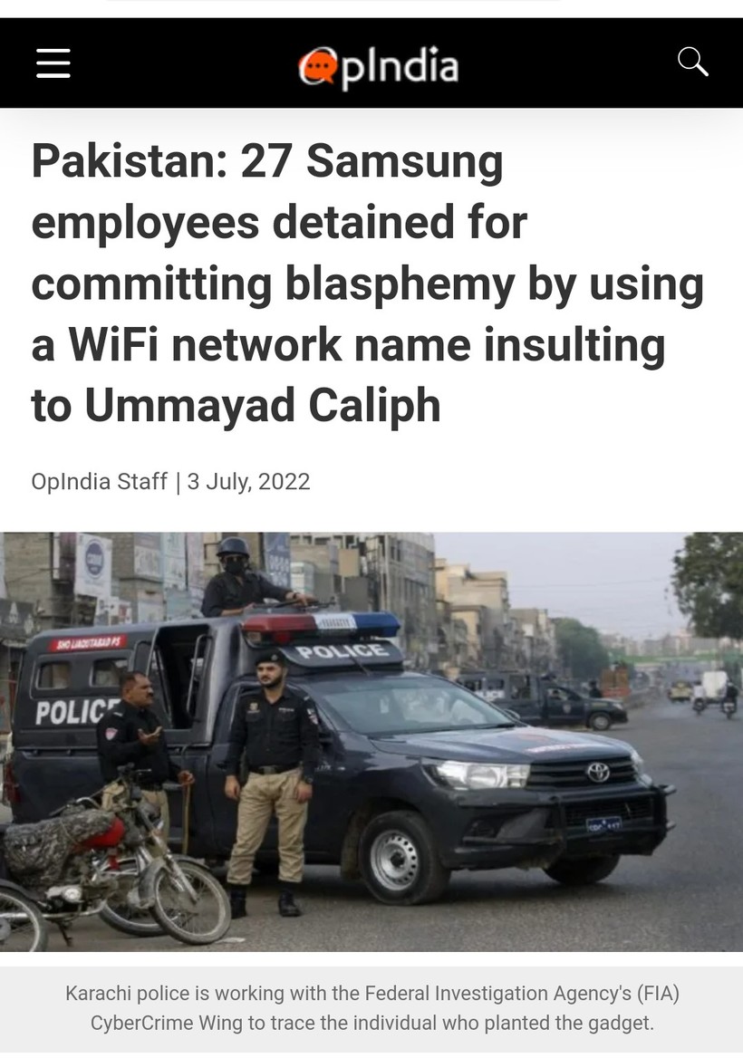 | ▲ 파키스탄 현지 매체는 신성모독 혐의를 받는 삼성전자 직원 27명을 구속하는 한편 카라치 경찰이 와이파이를 설치한 사람을 추적하기 위해 연방수사국 사이버 범죄수사대와 협력 중이라고 보도했다. |