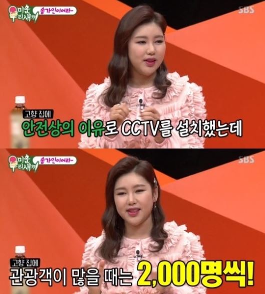 이날 신동엽은 "부모님이 보고 싶을 때 CCTV를 본다고 들었다"라며 궁금해 했고 송가인은 "고향 집이 너무 알려져서 관광지가 돼버렸다. 그래서 안전상의 이유로 마당에 CCTV를 설치했다. 가족들이 수시로 본다. 오빠들도 보고, 나도 아빠가 보고 싶을 때 휴대폰으로 CCTV를 본다"라고 말해 놀라움을 자아냈다.