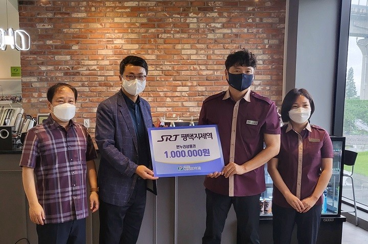 | ▲ SRT평택지제역 임직원으로 구성된 봉사단이 평안밀알복지재단을 방문해 100만원 상당의 온누리상품권을 기부하고 배식 봉사도 했다. |