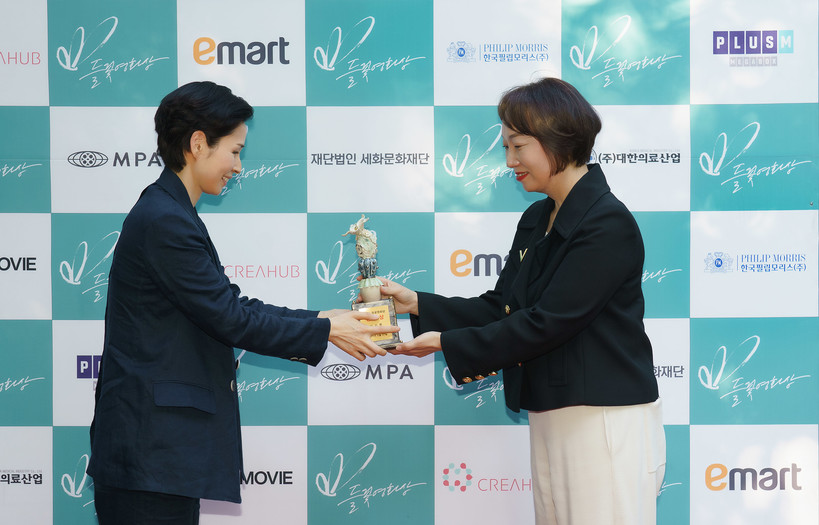 | ▲ 들꽃영화제에서 공로상을 수상한 트리플픽쳐스 강기명 대표(왼쪽)가 김기화 한국필립모리스 상무로부터 트로피를 받고 있다. [사진=필립모리스] |