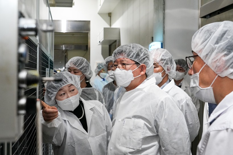 | ▲ 정갑영 SPC 안전경영위원회 위원장(가운데)과 조현욱 위원(왼쪽)이 경기도 평택 SPL을 방문해 생산라인 현장을 점검하고 있다. [사진=SPC] |