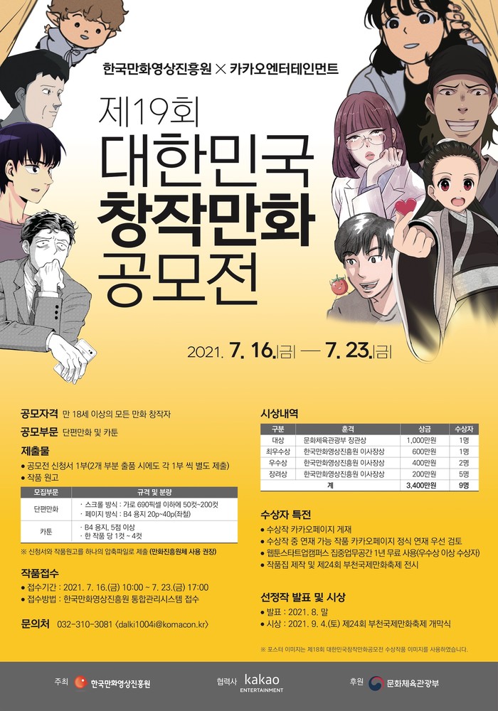 [하비엔=노이슬 기자] 화체육관광부와 한국만화영상진흥원에서 주최하는 ‘제19회 대한민국창작만화공모전’에 카카오엔터테인먼트가 협력사로 참여, 수상작에는 카카오페이지 작품 게재 및 웹툰 우선 연재 기회를 제공한다.