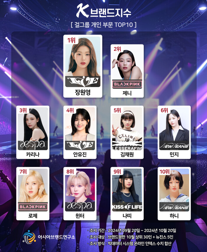 그 결과 K-브랜드지수 걸그룹 개인 부문은 아이브 장원영이 1위를 차지했고, 이어 블랙핑크 제니(2위), 에스파 카리나(3위), 아이브 안유진(4위), 르세라핌 김채원(5위), 뉴진스 민지(6위), 블랙핑크 로제(7위), 에스파 윈터(8위), 키스오브라이프 나띠(9위), 뉴진스 하니(10위)가 톱10에 이름을 올렸다.