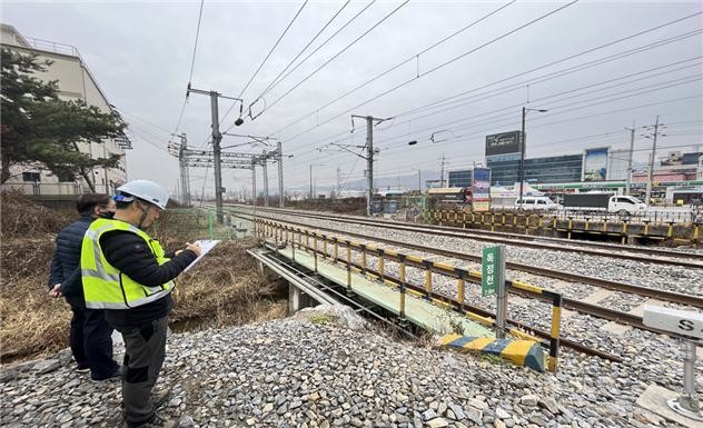 | ▲국가철도공단 충청본부 관계자가 지난달 22일 진원지 인근 충북선 독정천교(주덕~달천역 구간)를 민간전문가와 함께 점검하고 있다. |