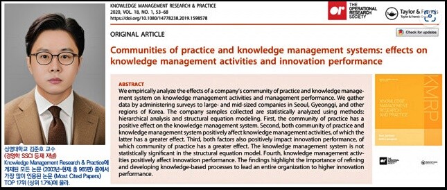 [하비엔뉴스 = 이정우 기자] 김준호 상명대학교 교수의 논문이 <Knowledge Management Research & Practice>