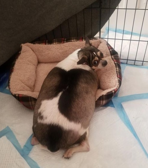 장애를 가진 과체중 치와와가 고속도로변에서 구조되어 회복 중이다.