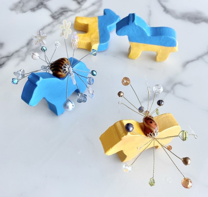 지난 4일 오픈한 김은영 작가 초대전 ‘편자, 피어나다’는 전시장 한 코너에 우크라이나 국기를 상징하는 파랑과 노랑으로 물들인 말 오브제들이 옹기종기 모여 있다. 우크라이나 평화를 기원하는 이 작품과 중앙에 전시된 100여개의 오브제의 판매 수익금은 모두 우크라이나 어린이를 위해 사용될 예정이다.