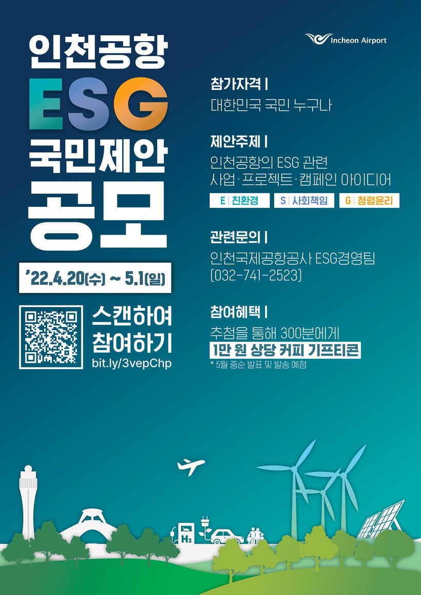[하비엔=문기환 기자] 인천국제공항공사는 국민의 눈높이에 맞는 ESG 경영 아이디어 발굴을 위해 ‘인천공항 ESG 국민제안 공모’를 시행한다고 밝혔다.
